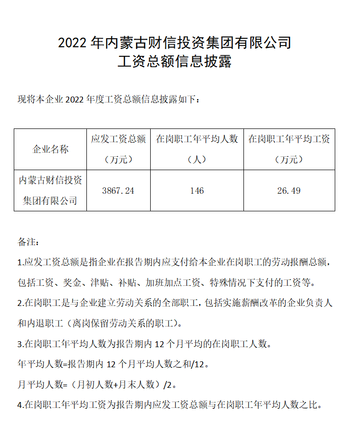 2022年內蒙古財信投資集團有限公司工資總額信息披露